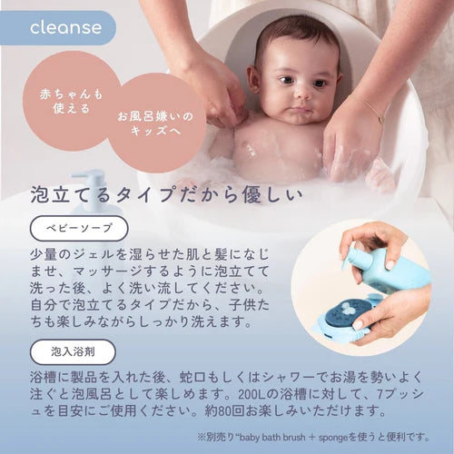 98.1%天然由来成分、10種類以上の天然由来成分を配合した、顔・髪・体すべてに使える全身ソープ「cleanse(クレンズ)」。新生児から使えるやさしい処方で、洗いながら肌のうるおいを守るジェルソープです。