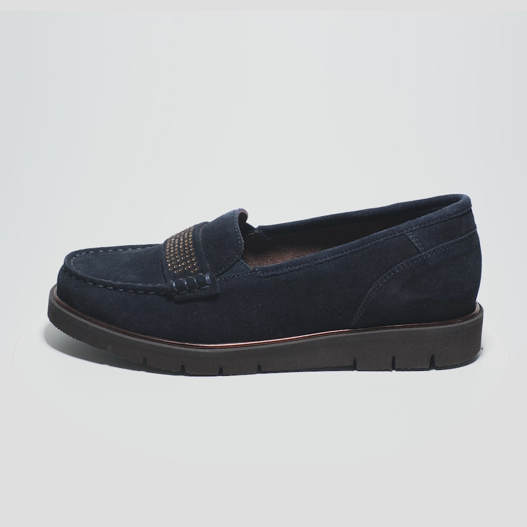 スエードレザーを使用したBLUEカラーにはブラウンゴールドのラインストーンがアクセント。